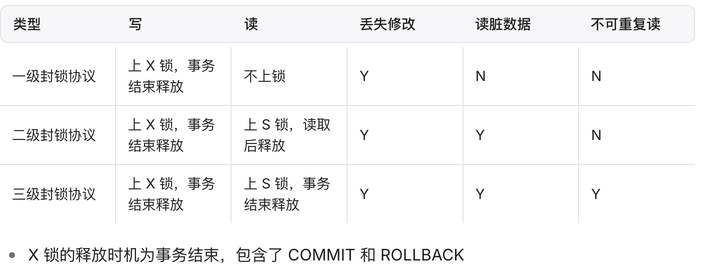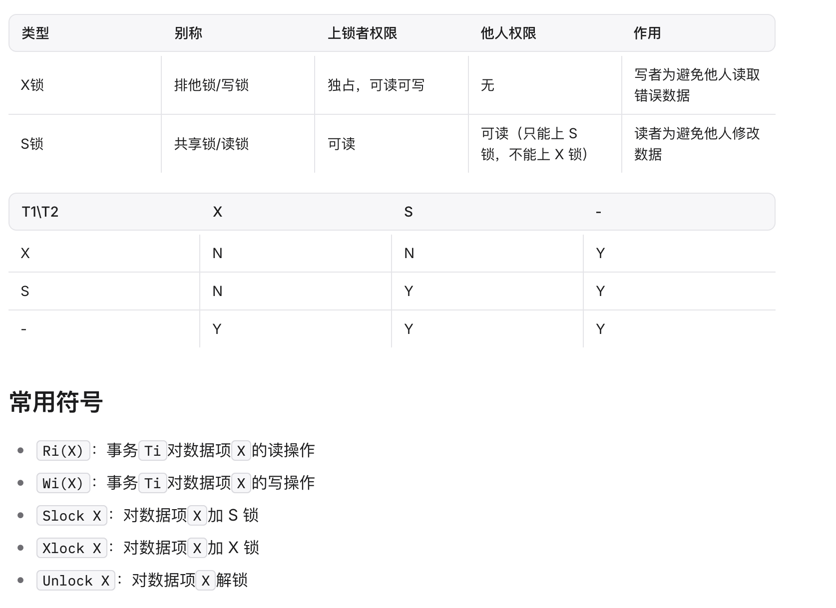 - 死锁:两个或多个事务互相等待对方释放锁,导致无法继续执行