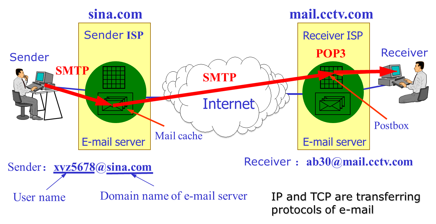 发送者先登录到服务器,通过服务器根据 SMTP 传输到对应的服务器,然后用户登录后通过 POP3 协议收邮件到本地。