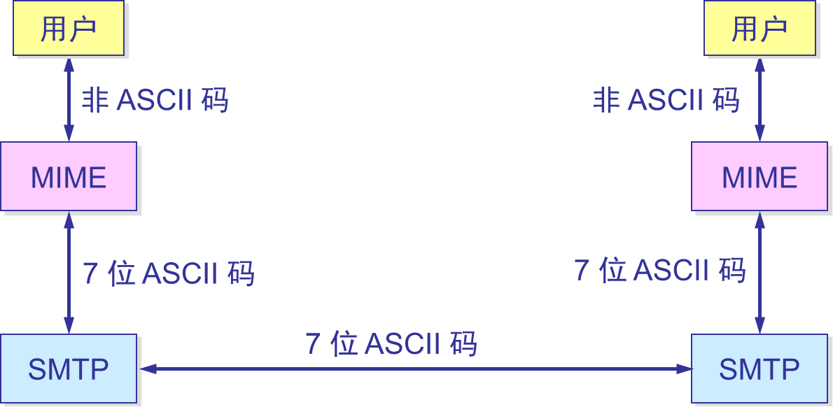 - 很多的文件(附件)并不是 ASCII 码的,我们需要用 MIME 将对应的文件进行转换(扩充)。过程如上图