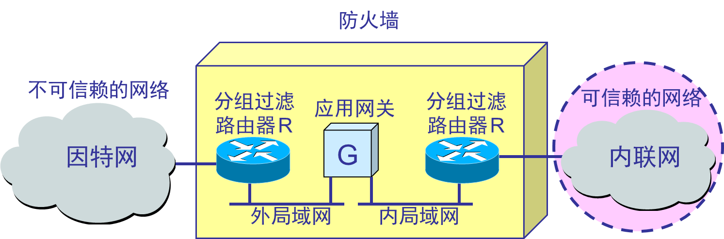 - 防火墙内的网络称为可信赖的网络(trusted network),而将外部的因特网称为不可信赖的网络(untrusted network)。