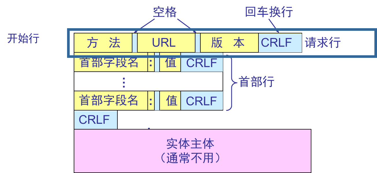 - 报文由三个部分组成,即开始行、首部行和实体主体。