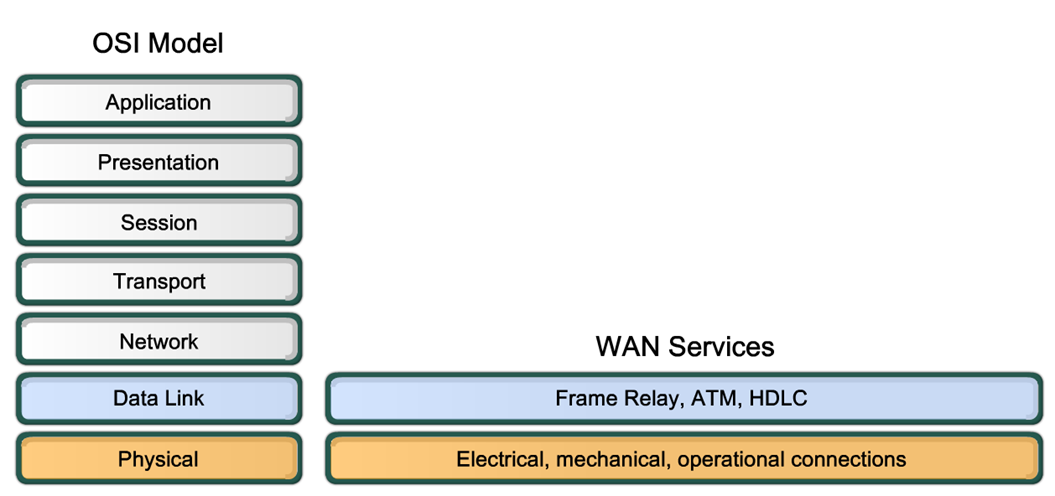 WAN 标准主要描述 OSI 模型的物理层和数据链路层,物理层提供电器标准,数据链路层封装到远程的部分:帧标准。