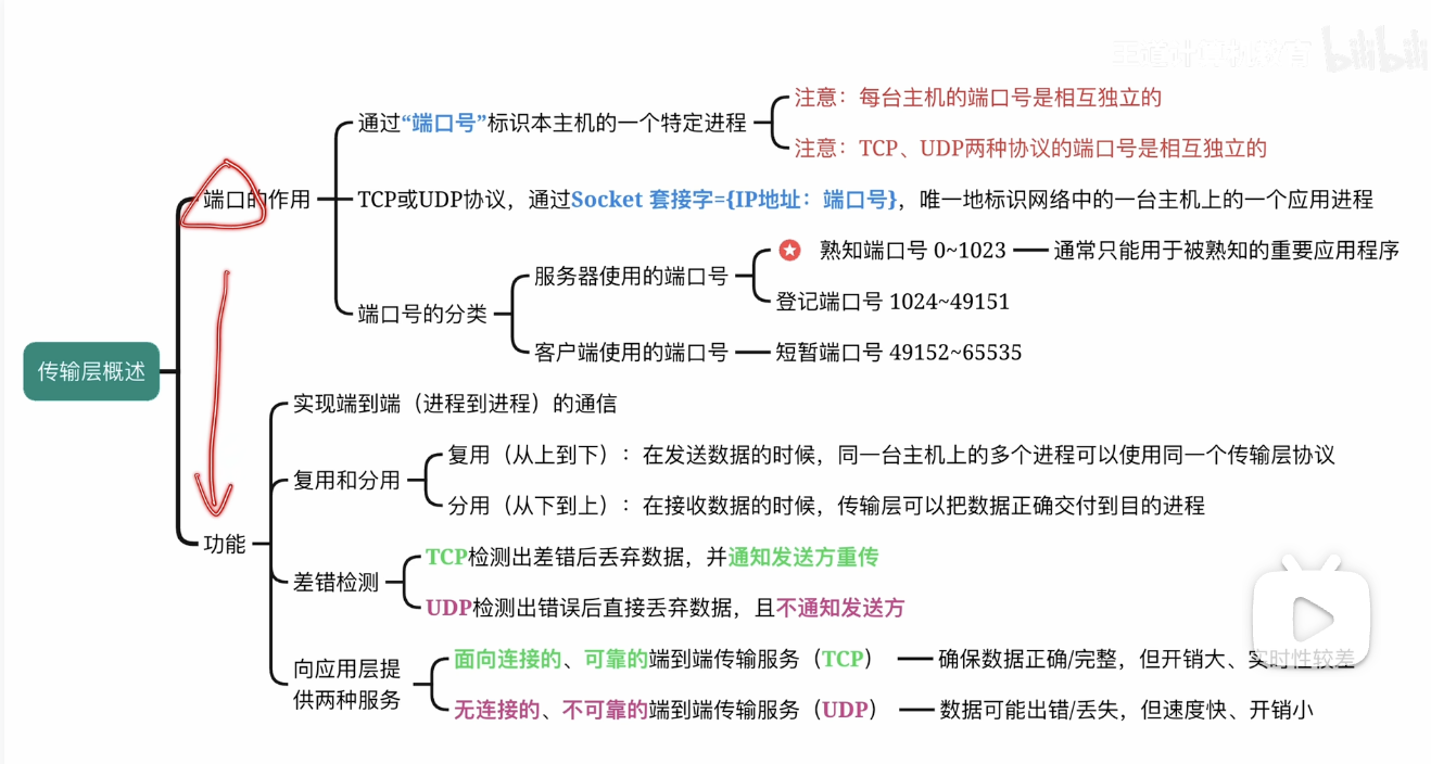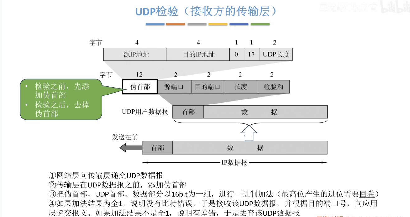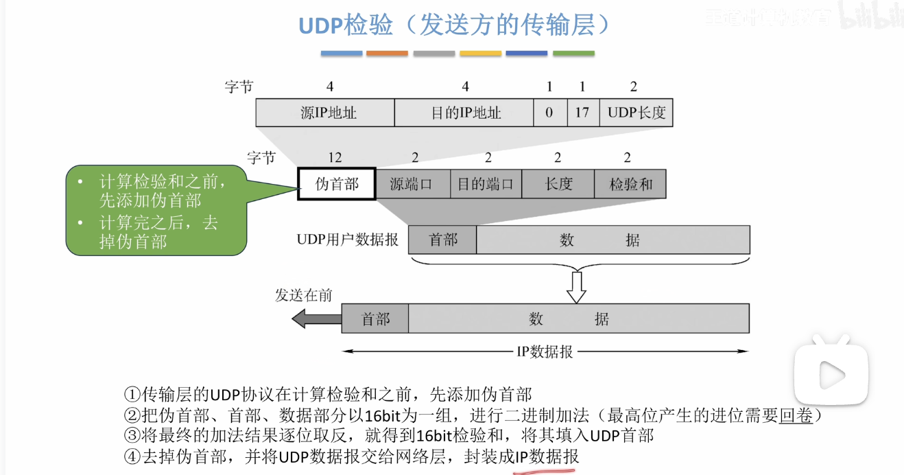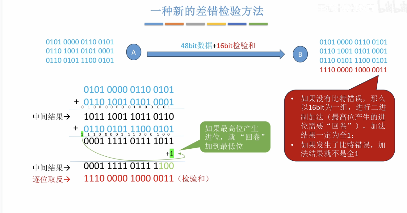 - 差错检测:发送方在包中添加校验和,接收方通过校验和判断数据是否出错。