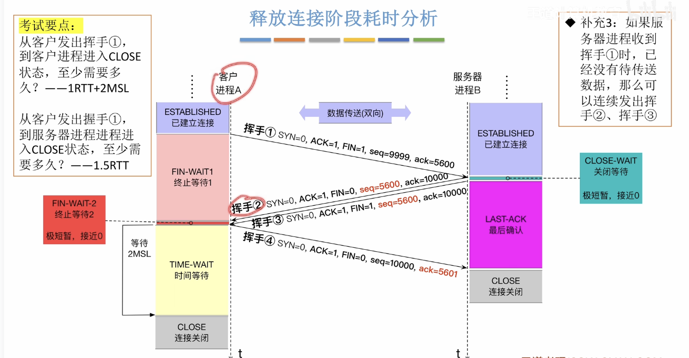 时间等待:因为接收方不一定成功收到挥手4,可能会重新发送挥手3,接着就会重新发送挥手4并且进入TIME-WAIT阶段