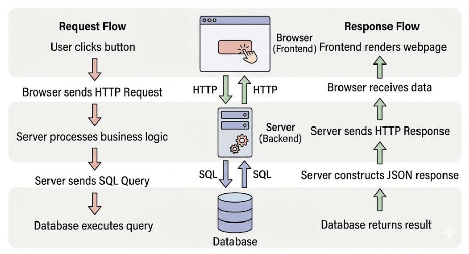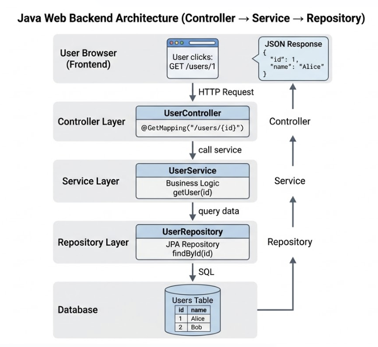 HTTP API — 接收请求 Business Logic — 处理业务逻辑 Data Persistence — 操作数据