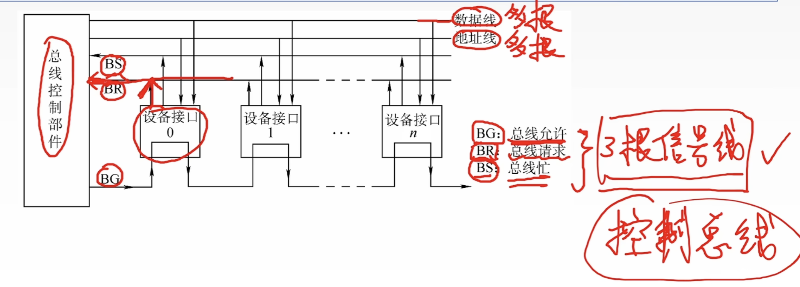 - BR/请求线:设备->仲裁器,表明需要使用总线