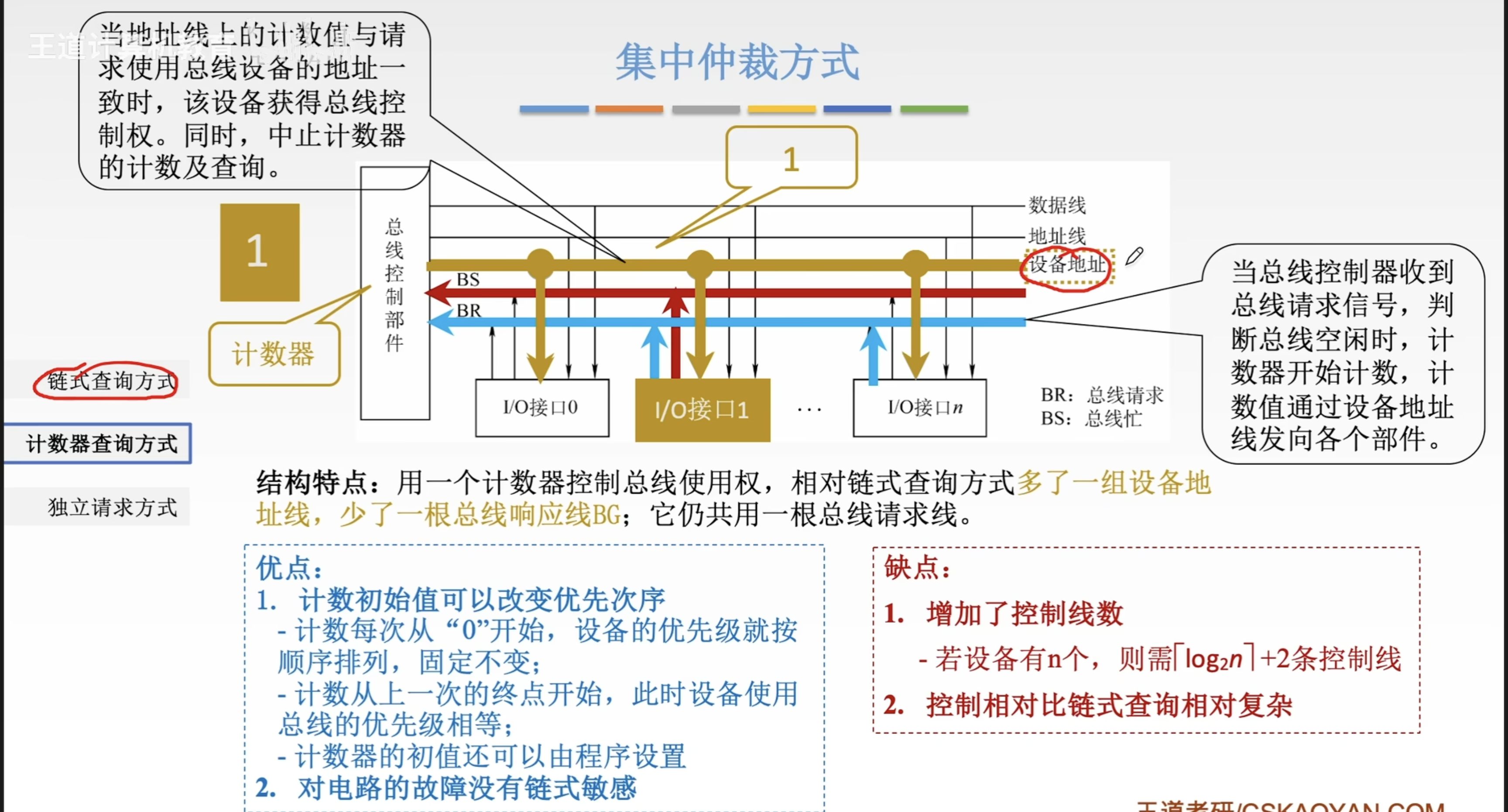 - 仲裁器决定优先级(固定/链式/LRU/FIFO……)
