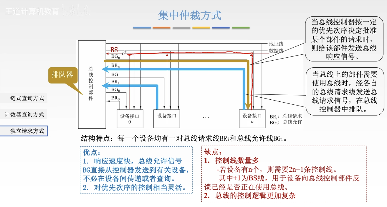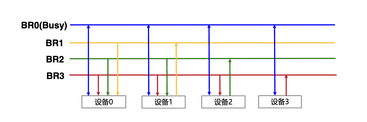 - 若设备收到允许信号并发起总线请求,设备将总线设置为繁忙状态,允许信号不再进一步传递