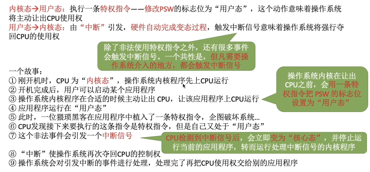 操作系统内核作为“管理者”,有时会让CPU执行一些“特权指令”,如内存清零指令。这些指令影响重大,只允许内核使用。