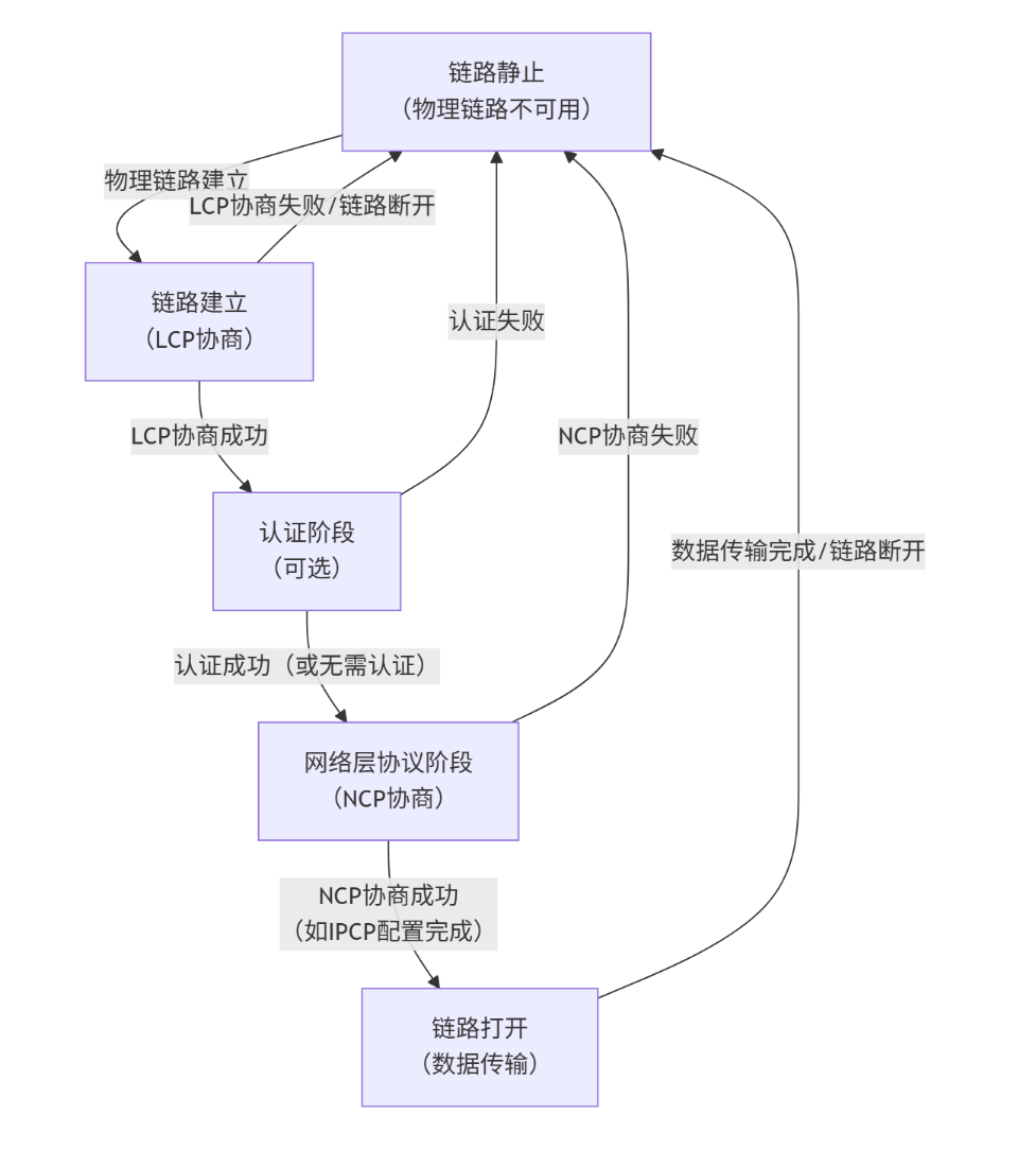- 结束: 当数据传输完成,或用户手动断开连接,或检测到链路故障时,会通过交换LCP的终止帧来优雅地关闭链路,然后回到“链路静止”状态。