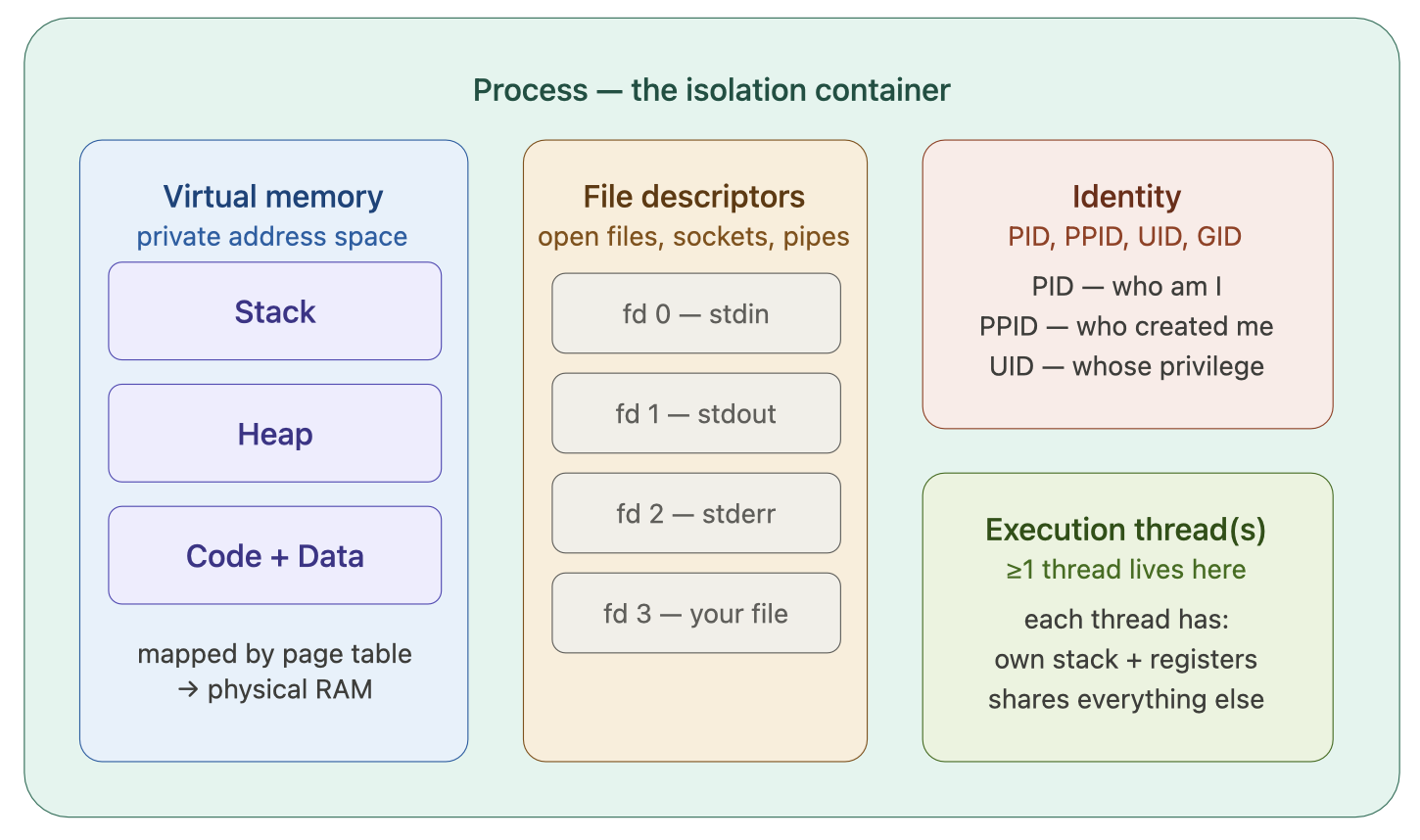 所以进程并不仅仅是”运行中的程序”这么简单。它是操作系统构建的一个隔离容器,里面装着程序运行所需的全部资源视图。