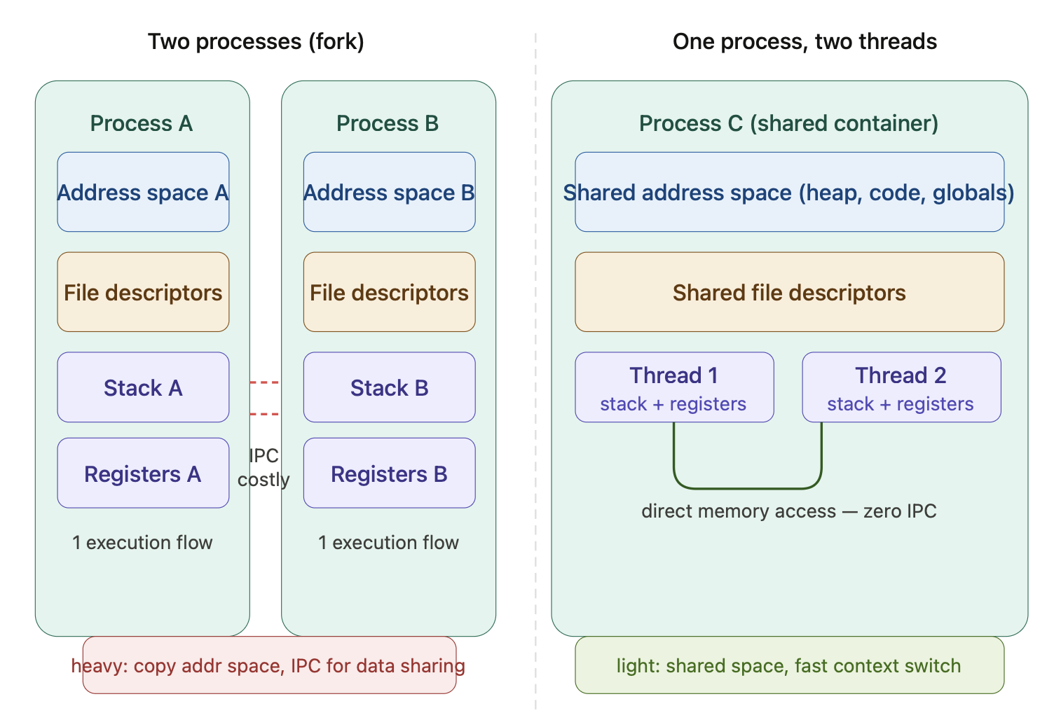 但是太朴素了,因为:fork() 会复制父进程的整个地址空间(虚拟内存映射、文件描述符表……),这个操作很重。更糟的是,两个进程想共享数据很难——它们的地址空间是隔离的,通信必须走 IPC(管道、共享内存、socket 等),又慢又复杂。