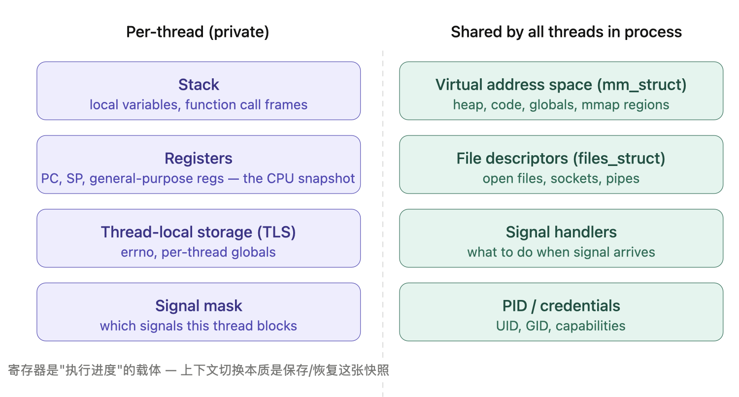 寄存器保存的是”当前执行到哪里了”——程序计数器 PC 指向下一条要执行的指令,栈指针 SP 指向当前栈顶。如果两个线程共享寄存器,它们根本没法同时存在于不同的执行位置。寄存器的私有性,是并发执行成为可能的前提。
