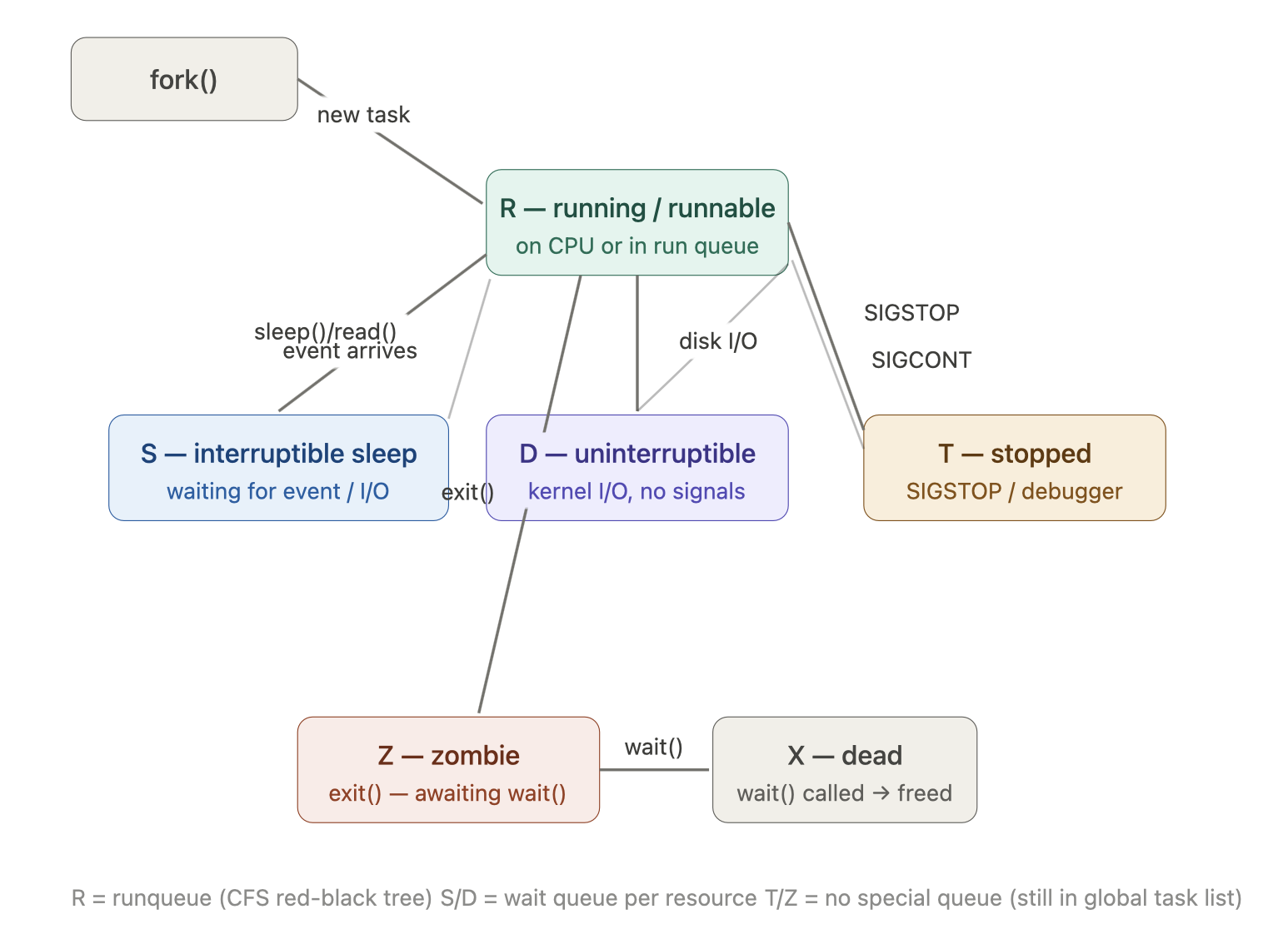 调度器需要知道:现在哪些 task 可以被放上 CPU? R 状态就是这个问题的答案——所有 R 状态的 task 构成”候选池”。