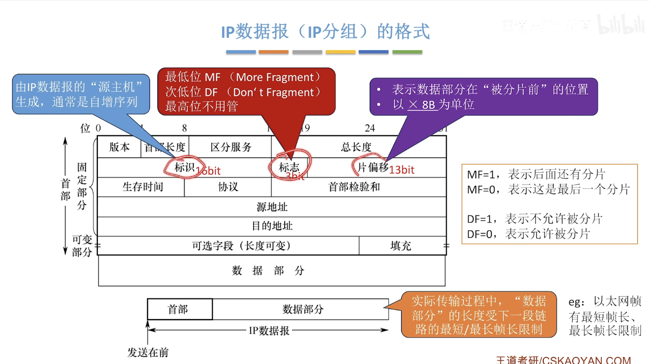 - 由于首部的“片偏移”字段是以*8B为单位,因此,除了最后一个分片外,其他每个分片的数据部分必须是8B的整数倍