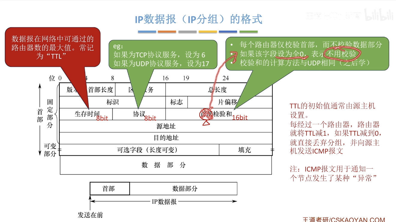 - 生存时间:防止数据包在网络中无限循环。每经过一个路由器,该值减1,减到0时数据包被丢弃。