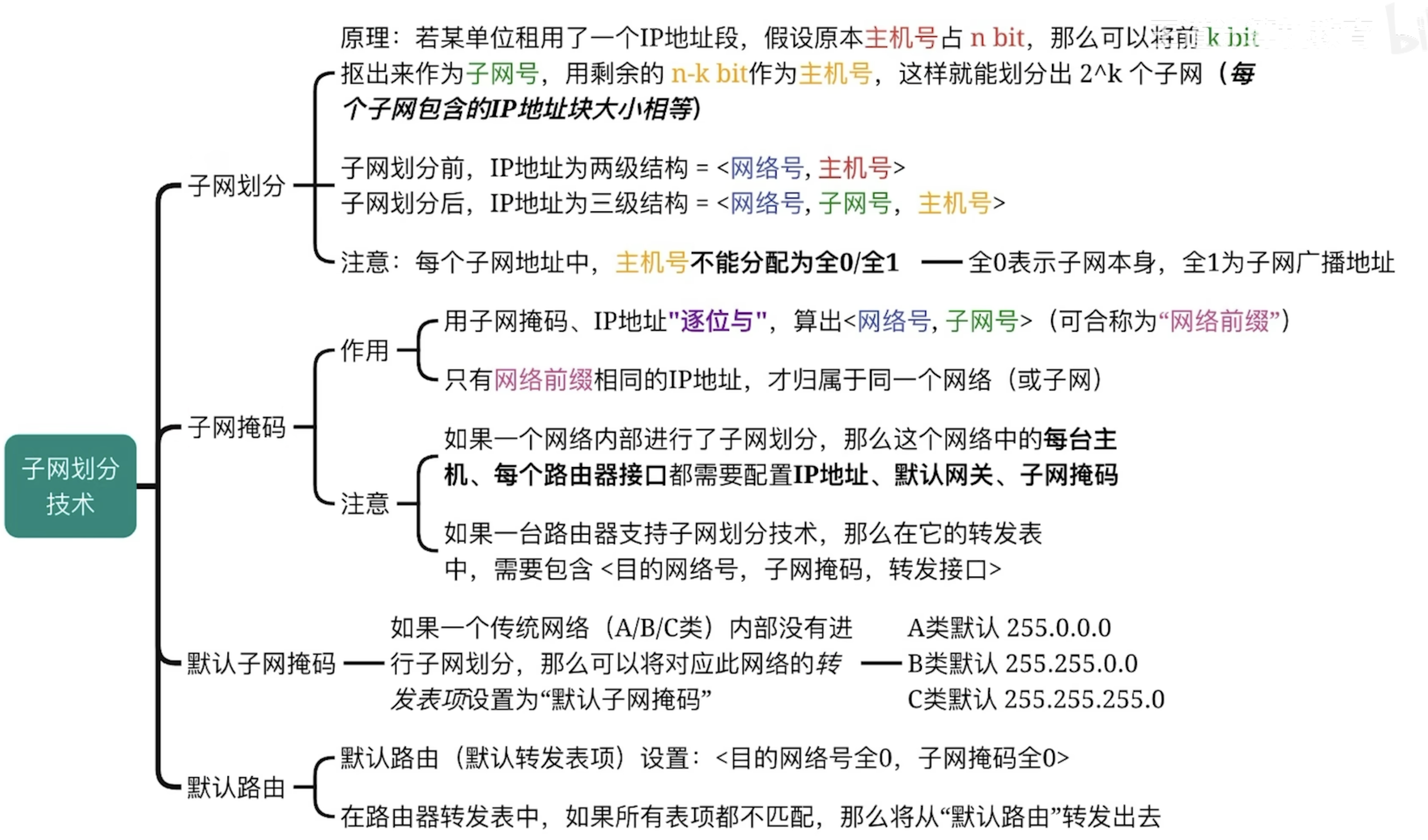 引入了子网划分技术后,除了默认网关和IP地址后,还要给主机配置子网掩码,目的是得到IP地址的网络号和子网号