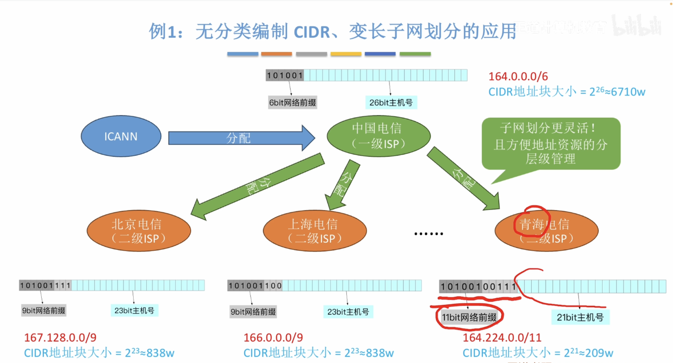 定长子网划分:在一个CIDR地址块中,把主机号前K bit抠出来作为定长子网号,这样就能划分出2^k^个子网(每个子网包含的IP地址块大小相等)【与传统的子网划分技术同理】
