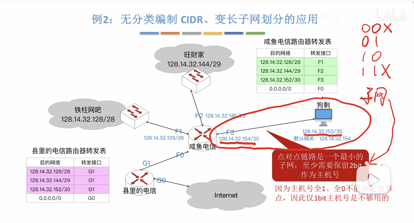 我们看这个图,狗剩只有一台主机,想要点对点连接到路由器,但是因为路由器的接口需要一个IP地址,我们不得不给它分配四个IP地址,原因如图