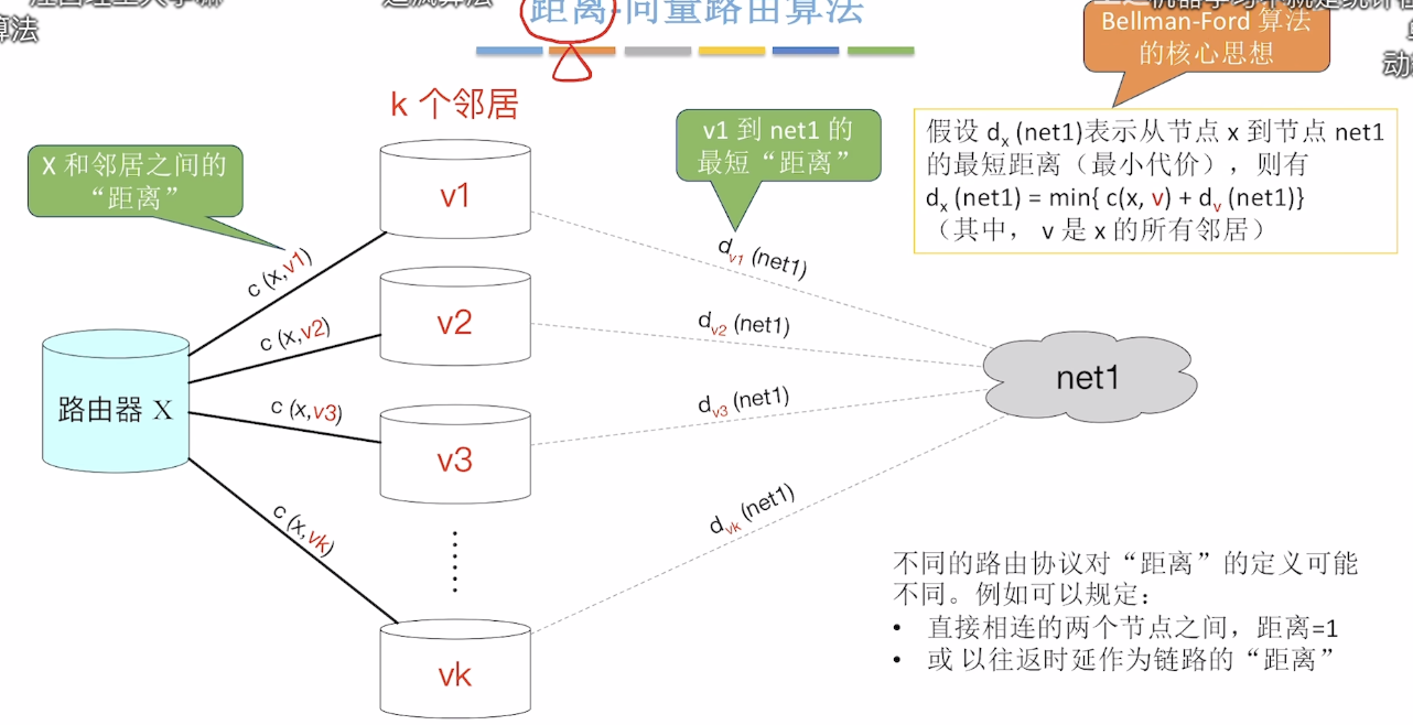 距离-向量路由算法:不必关心完整的网络拓扑结构,只需要关心你和熟人之间的距离、各个熟人和目的节点之间的最短距离