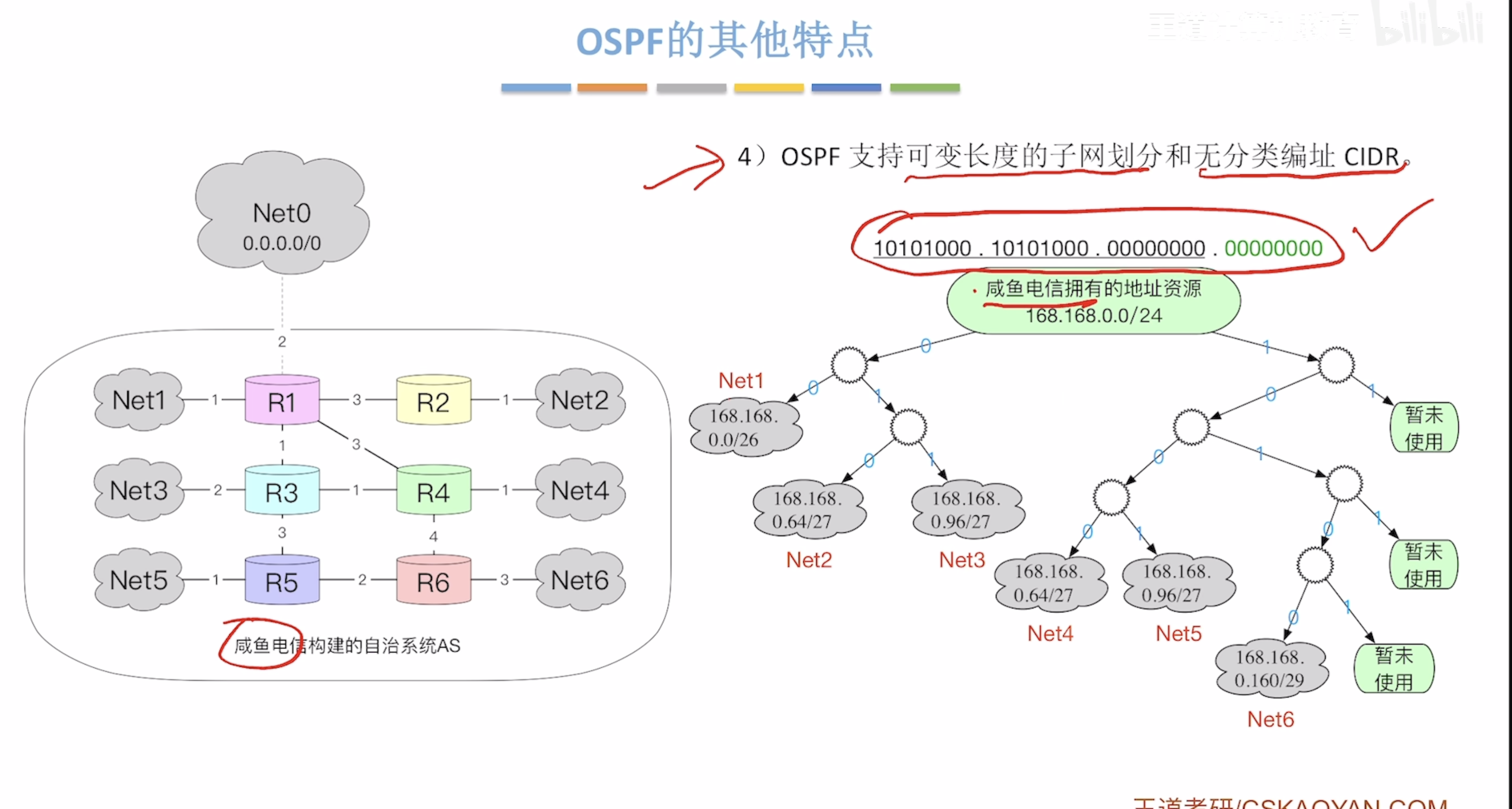 变长子网划分:在一个CIDR地址块中,划分子网时,子网号长度不固定!