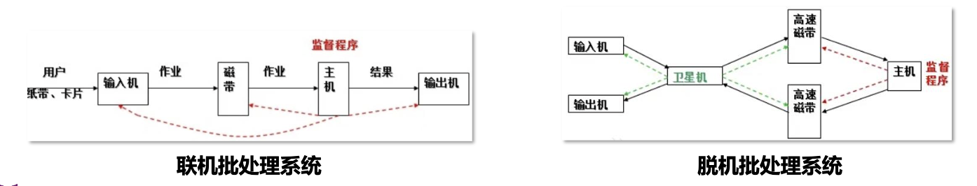 - 批处理系统:加载在计算机上的一个系统软件,在它的控制下,计算机能够自动地、成批地处理一个或多个用户的作业(包括程序、数据和命令)