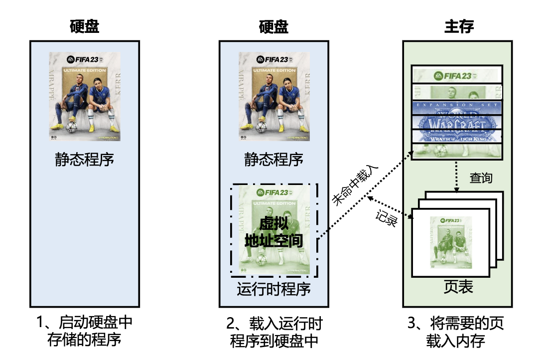 - 基本思想:请求分页,仅将当前需要的页面调入主存