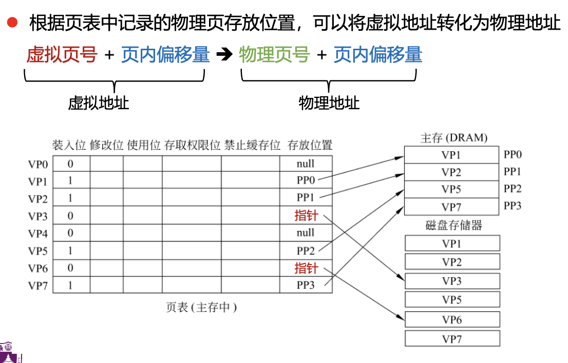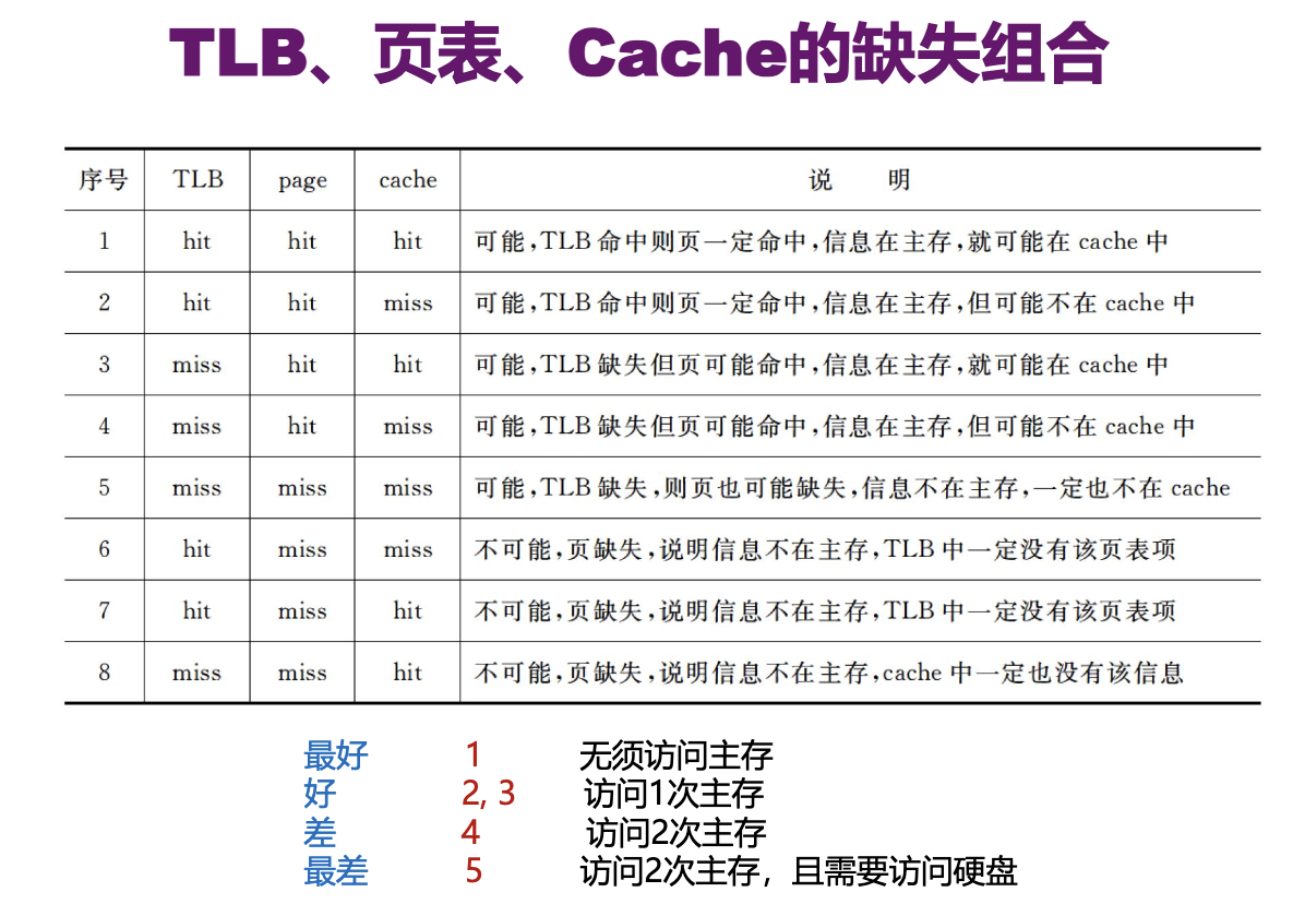 - 页表包含了所有虚拟页的信息:存放位置(页框号)、valid bit、dirty bit、存取权限