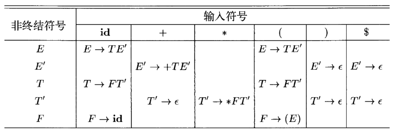 核心结构:二维表M[A,a] ,含义:当栈顶为A,当前input为a,该用哪个产生式呢?