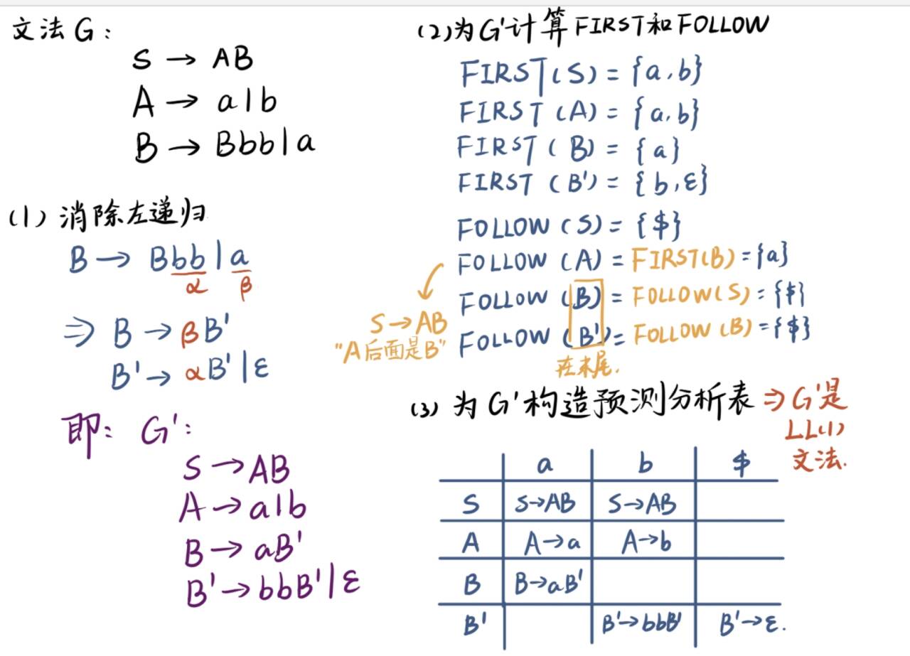 - 若 ϵ∈FIRST(β) 或 β=ϵ,把 FOLLOW(A) 加入 FOLLOW(B)