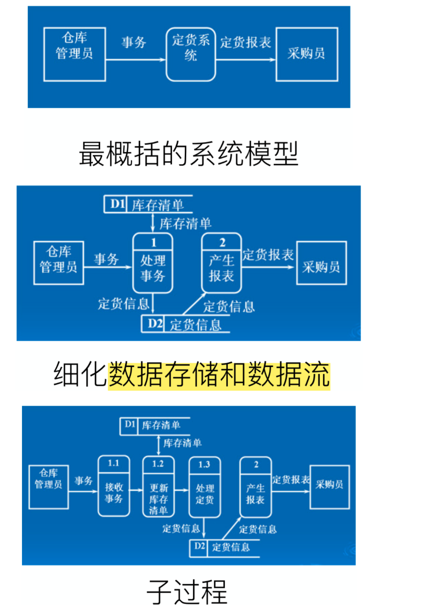 过程不一定是程序,可以是任何的能够处理的模块,甚至是人工处理 数据存储不一定是一个文件,可能是文件的一部分,或者是数据库元素等等,它代表静态的数据 数据流代表动态的数据