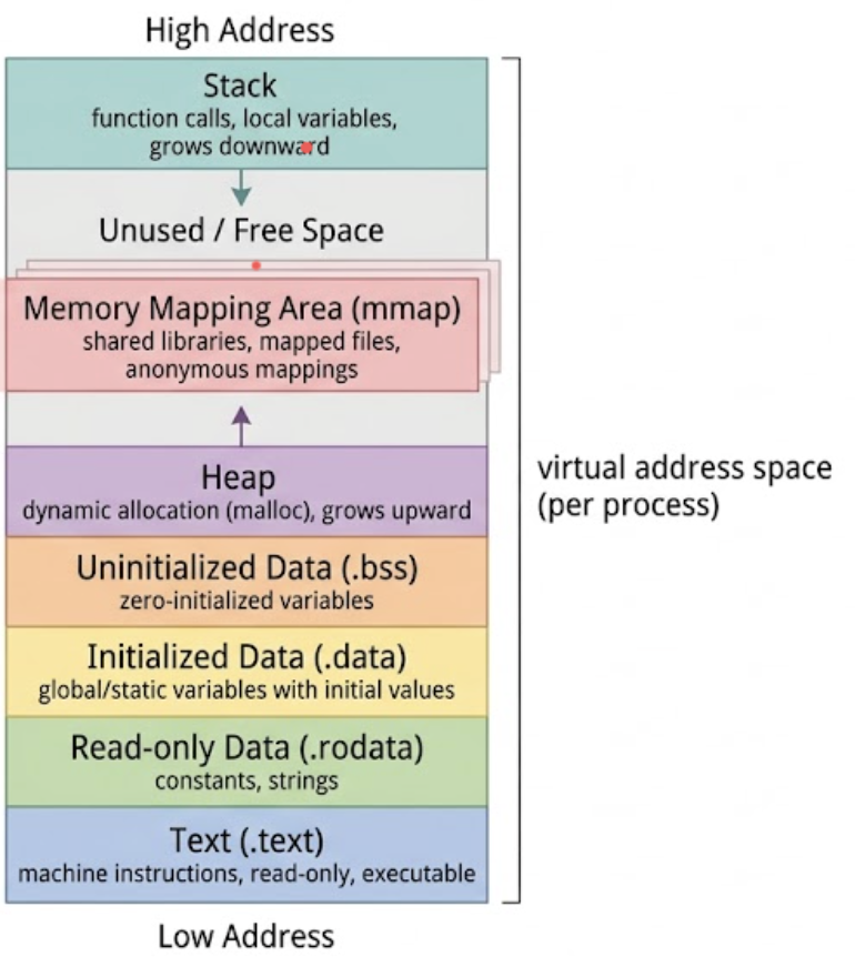| 加载(load / execve) | OS 把 ELF 文件映射到进程虚拟地址空间 | 每个段的虚拟基址在运行时确定(ASLR) |