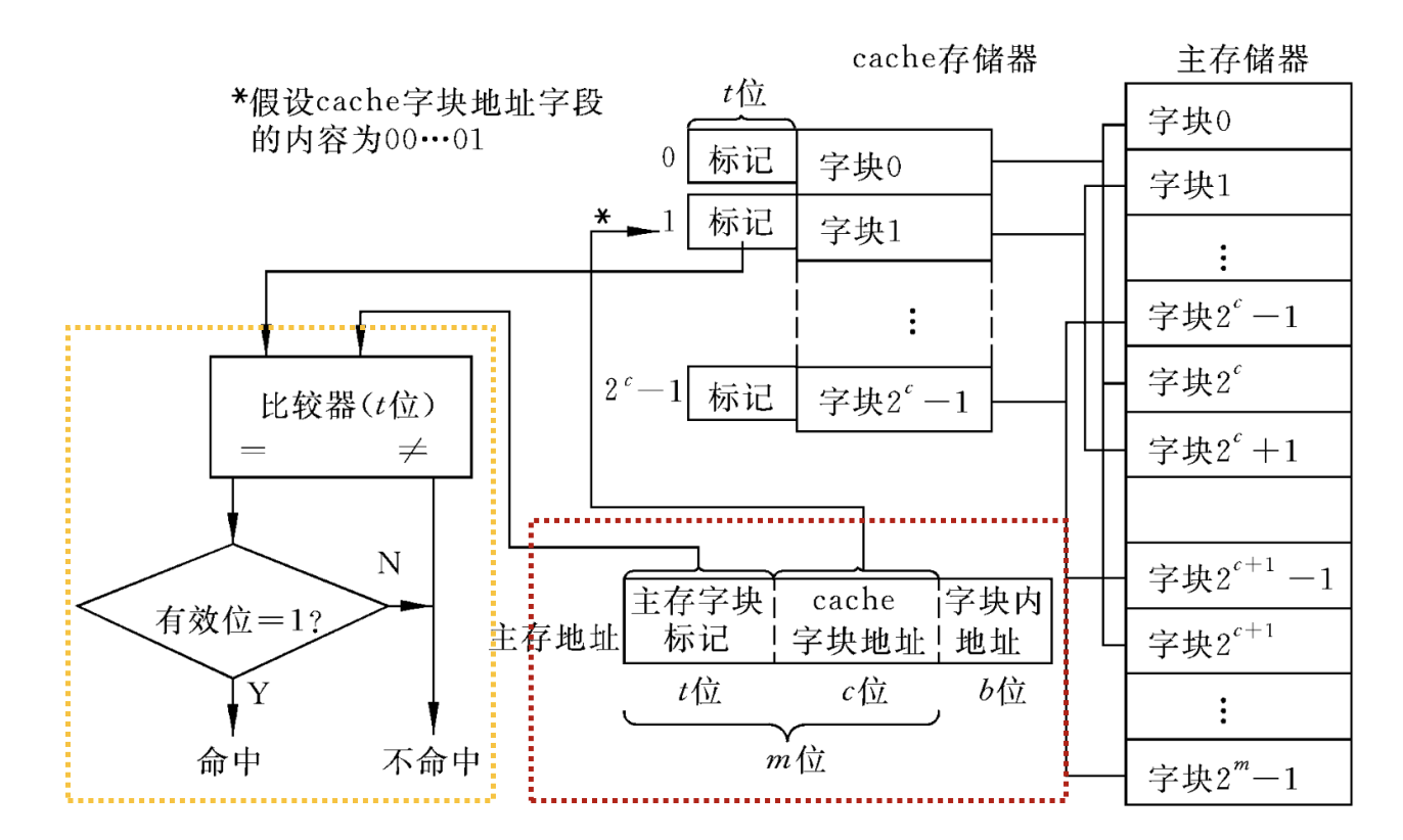 - 将这个标记与Cache中所有行的标记同时进行比较(这是一个并行的过程,需要昂贵的硬件电路,称为相联存储器)。