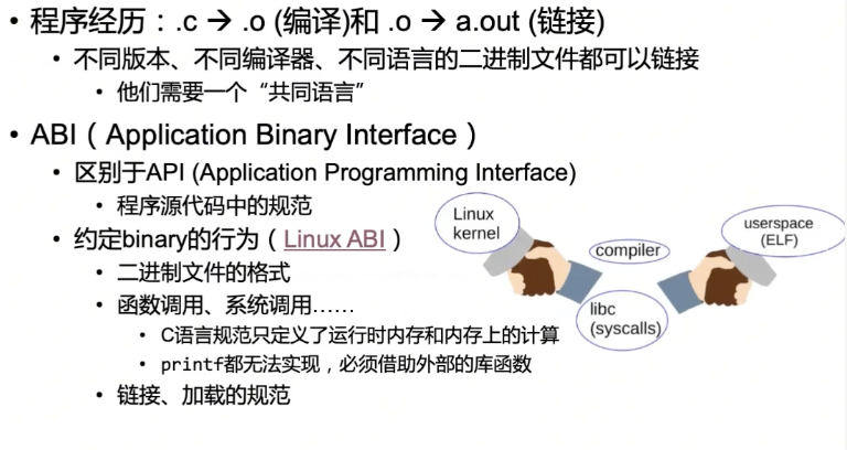 API 是程序员之间的约定,而 ABI 是编译器、链接器、操作系统和硬件之间的约定。